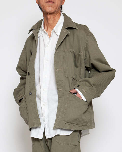 1940年代のUSMC (US MARINE CORPS)のユーティリティユニフォームで使用されていたヘリンボーンツイルをレプリカした生地。