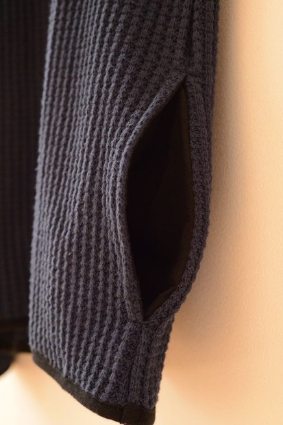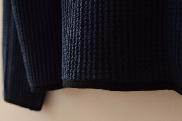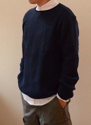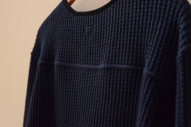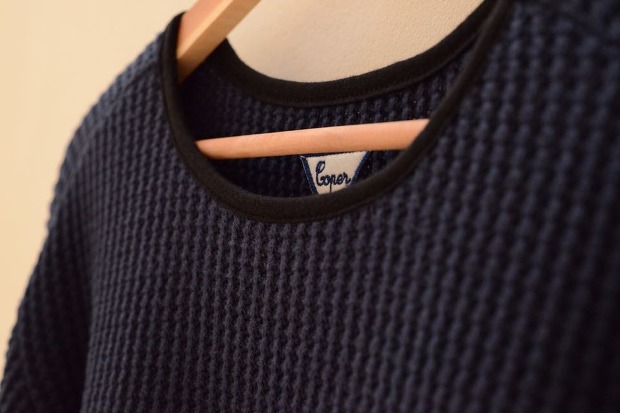 コペルオリジナルのワッフルクルーネックです。コットン100%のローゲージの糸を使っいるので、ニットの様なふんわり肉厚な感じです。
