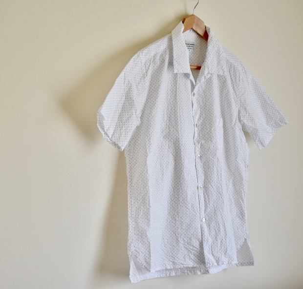 ワッシャー加工の施された60のタイプライターに細かいドットプリントの生地を使用したオープンカラーシャツ。清涼感漂う大人の雰囲気あります。