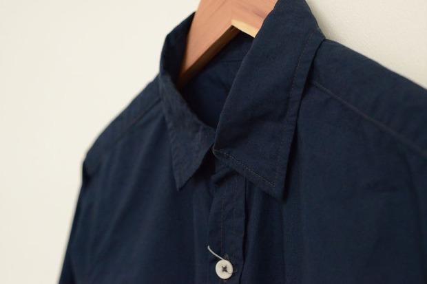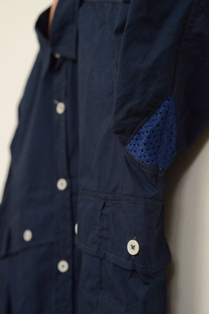 フロントから脇したまで回り込むように備えらつけられたカーゴポケットが印象的なフィッシングシャツです。素材は軽くてコシのあるタイプライタークロスです。左カフスには時計が見やすいようにラウンドしていて便利な仕様になってます。