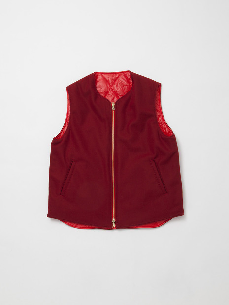ウールメルトンとハイテク機能綿“THINSULATE/シンサレート”を使ったキルティングのリバーシブルベスト。特徴的なキルティングのギュムッとした表情メルトンの落ち着いた表情の2面楽しめます。