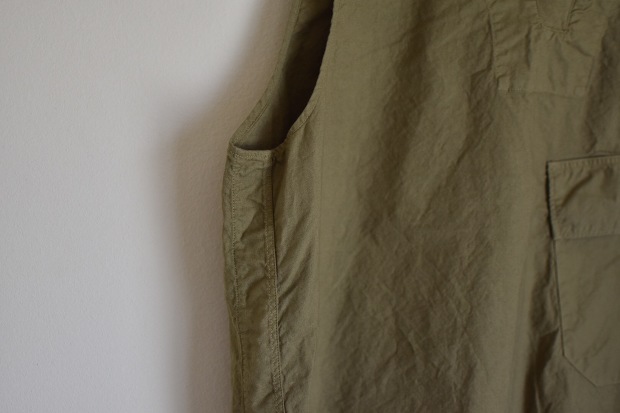 素材本来の物性を活かし染料の調整をし製作されています。襟裏とポケット部分はハリの強いタイプライタークロスを使用することで立体的なシルエットを作ってます。TシャツやロンTの上にプラスオン出来、コーディネートの幅が広がります。