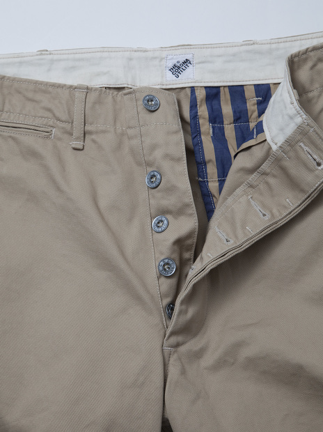 ヒップパッチ付きでサイドシームも巻き縫いのミリタリー・チノらしい仕上がりです。