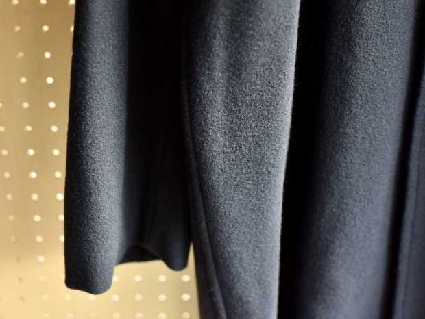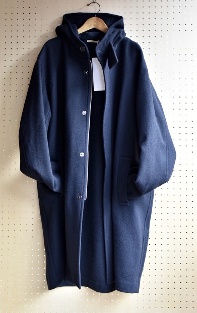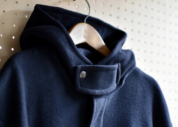 軽くて柔らかい素材として定評のあるラムウールを使ったフードコート。身幅をたっぷりとっているのでジャケットの上からも羽織れオーバーコートとしても使えるシンプルで合わせやすい仕上がりです。トグルのないファスナーと金属ボタン使いのダッフルコートといった印象です。