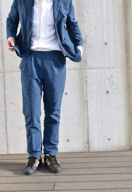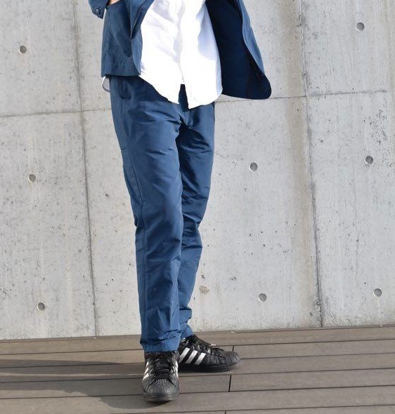 細身ですが、タックや股下にガゼットが入っているので締め付け感がない履き心地になってます。